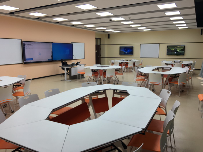 根据国家高校教育发展改革的需要和高校人才培养模式创新的需要,为推进我校应用型本科转型发展建设地方一流本科应用大学。教务处经多方论证,与教师教育学院共同建设了新型智慧教室。我校智慧教室于2020年11月开始建设,投入948545元,12月4日,通过教师教育学院、国有资产管理办公室、教务处三方验收,正式投入使用。