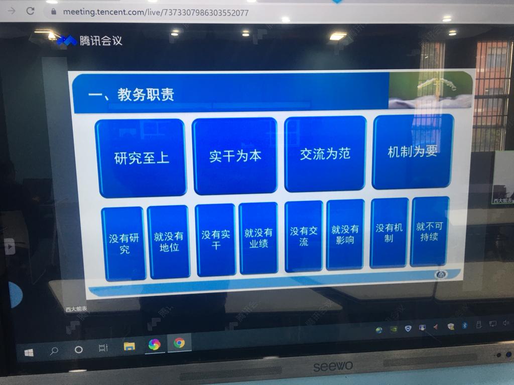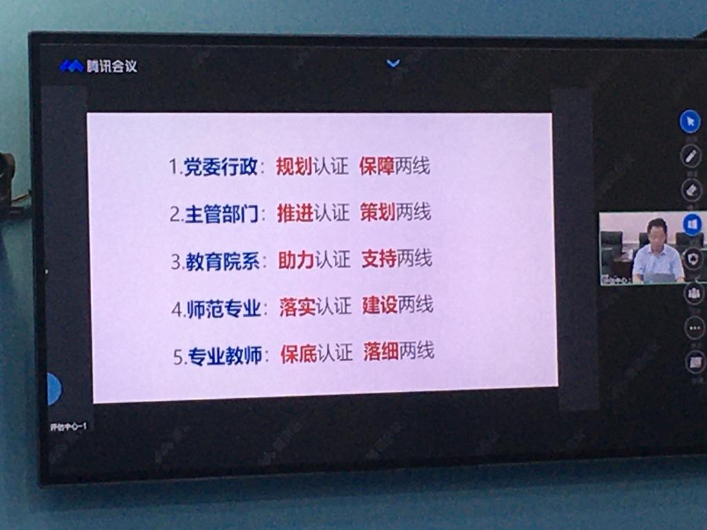 为贯彻落实《中共中央国务院关于全面深化新时代教师队伍建设改革的意见》及《深化新时代教育评价改革总体方案》有关要求,全面、高质量推进师范类专业认证工作,教育部高等教育教学评估中心于2021年9月26日举办“2021年师范类专业认证第二期学校培训”,教务处根据文件要求,在第12教学楼101、103智慧教室组织了师范专业所属二级学院的院长、教学副院长、专业负责人(美术、体育、数学与信息技术学院,仅需教学副院长和专业负责人参加培训)参加了培训,同时章新副校长、教务处全体工作人员、本科教学质量监控与评估中心及师范专业认证的相关工作组人员也参加了培训。地理与国土工程学院单独设立培训学习地点。