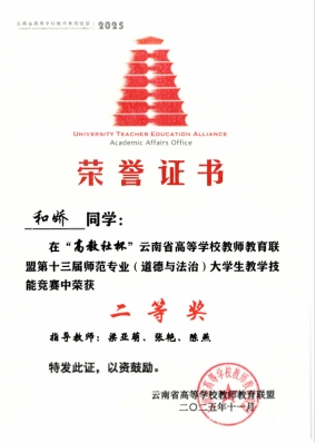 此外,马克思主义学院的和娇同学获得二等奖。同学们的出色表现,充分展现了我校师范生扎实的专业素养和良好的精神风貌。