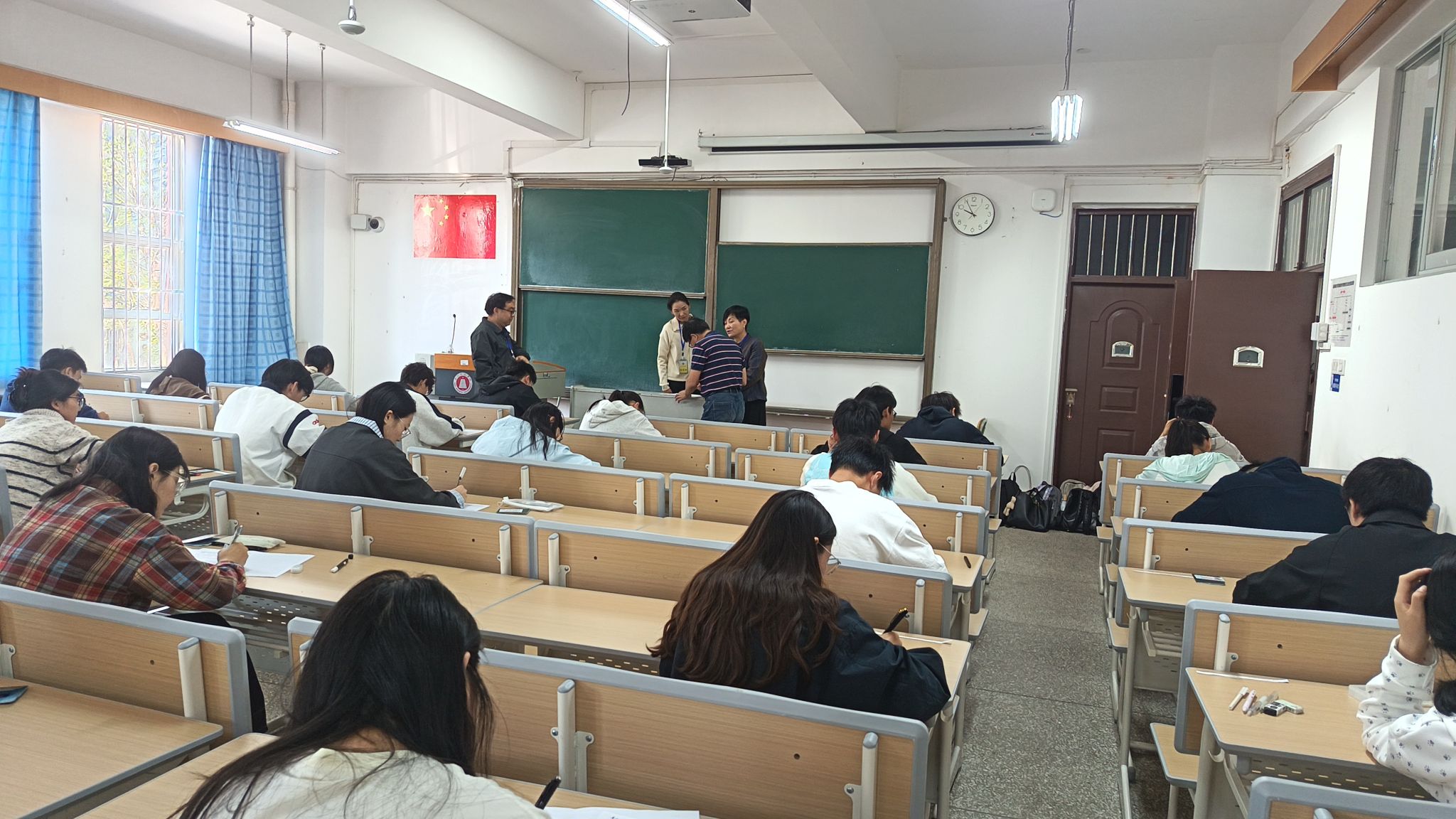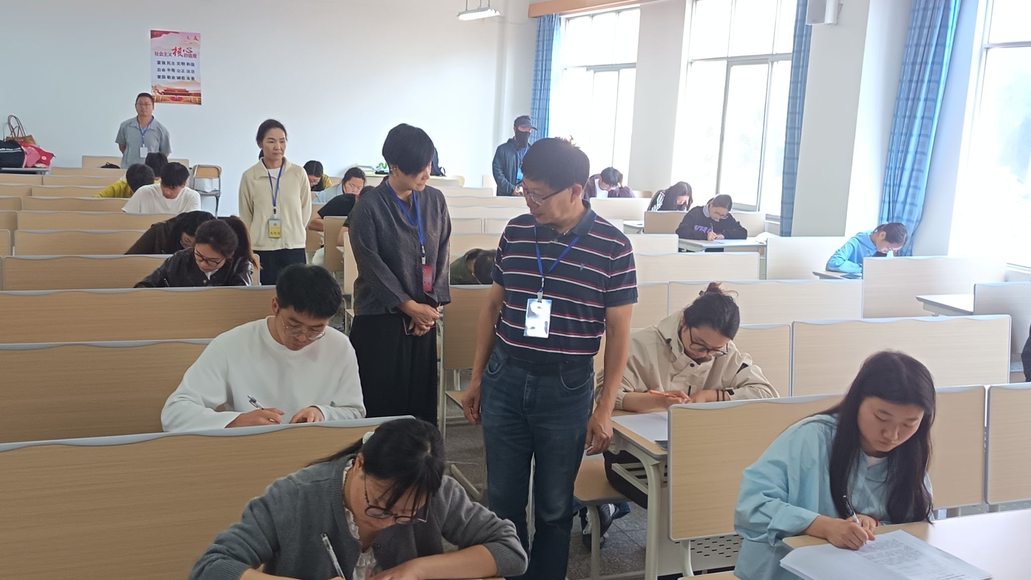 考试期间,副校长章新、教务处相关工作人员对各考场进行全程巡视督查。各考场严格落实考纪要求,课桌规范摆放,物品分区存放。监考教师认真履行监考职责,严格核查考生学生证、身份证,督促考生规范存放手机等电子设备,全程专注监考。全体考生严格遵守考试纪律,诚信应考,展现了我校师范生良好的学风考风。