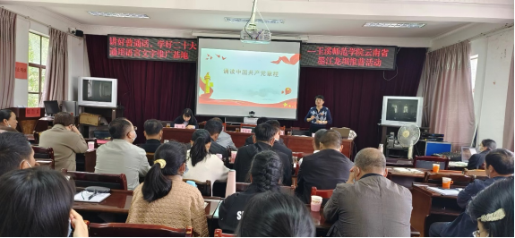 2022年10月28日,推普基地成员在曹冰雪主任的带领下,到了玉溪师范学院省级乡村振兴帮扶点墨江县龙坝镇,对基层领导干部开展国家通用语言推广活动。活动由国家级普通话测评员、教授、博士等组成的推普团队对参训干部进行普通话正音训练,以领读和集体诵读的形式,原文学习二十大报告中的金句、热词和新党章的相关内容。规范普通话的推广使用有助于边疆民族地区基层干部更加全面准确地学习领会党的二十大精神,不断增强国家通用语言文字的应用能力。