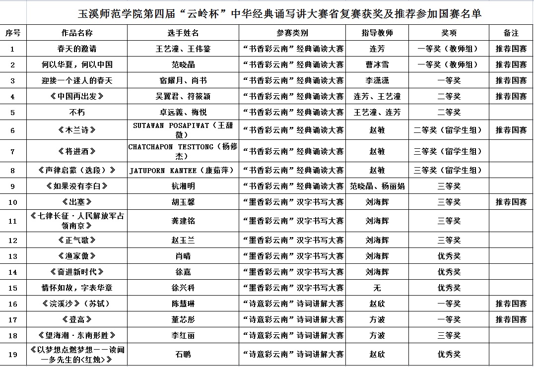 收到大赛通知后,玉溪师范学院高度重视,校语委迅速启动宣传动员和准备工作,师生参赛热情高涨,最终共报送诵读、讲解、书写初赛作品46件。经过学校组委会评选,共报送25件作品参加省级复赛。经评选,在第四届“云岭杯”经典诵写讲大赛中,玉溪师范学院共有19件作品获奖,一等奖5项,二等奖3项,三等奖7项,优秀奖4项,其中8件作品获推荐参加全国赛。