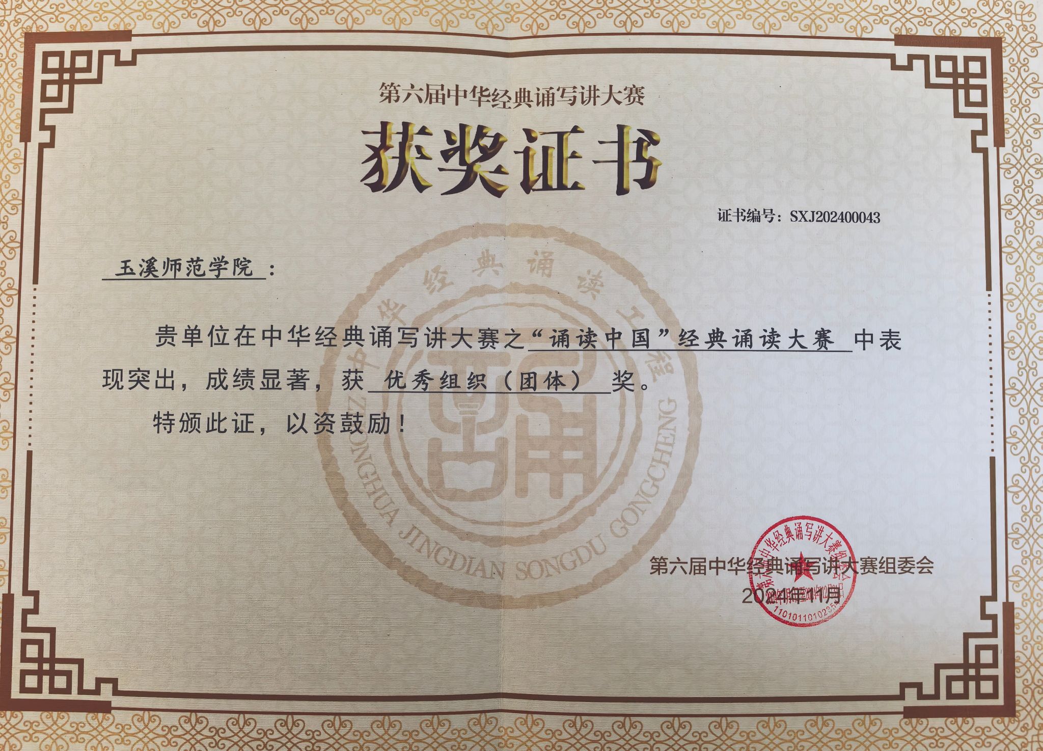 在教育部、国家语委主办的第六届中华经典诵写讲大赛中,玉溪师范学院凭借出色的组织工作和优异的参赛成绩,被授予优秀组织(团体)奖。