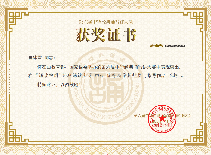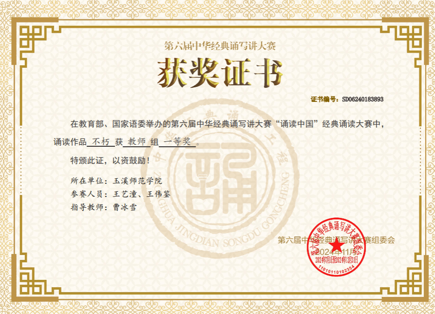 在第六届中华经典诵写讲大赛中,我校共有53件作品获省级复赛奖项,8件作品在全国总决赛中获奖,涵盖经典诵读、汉字书写、诗词讲解三大赛项,其中教师组朗诵作品《不朽》(朗诵者:王艺潼、王伟鉴)荣获诵读大赛全国一等奖,曹冰雪荣获诵读大赛优秀指导教师称号。