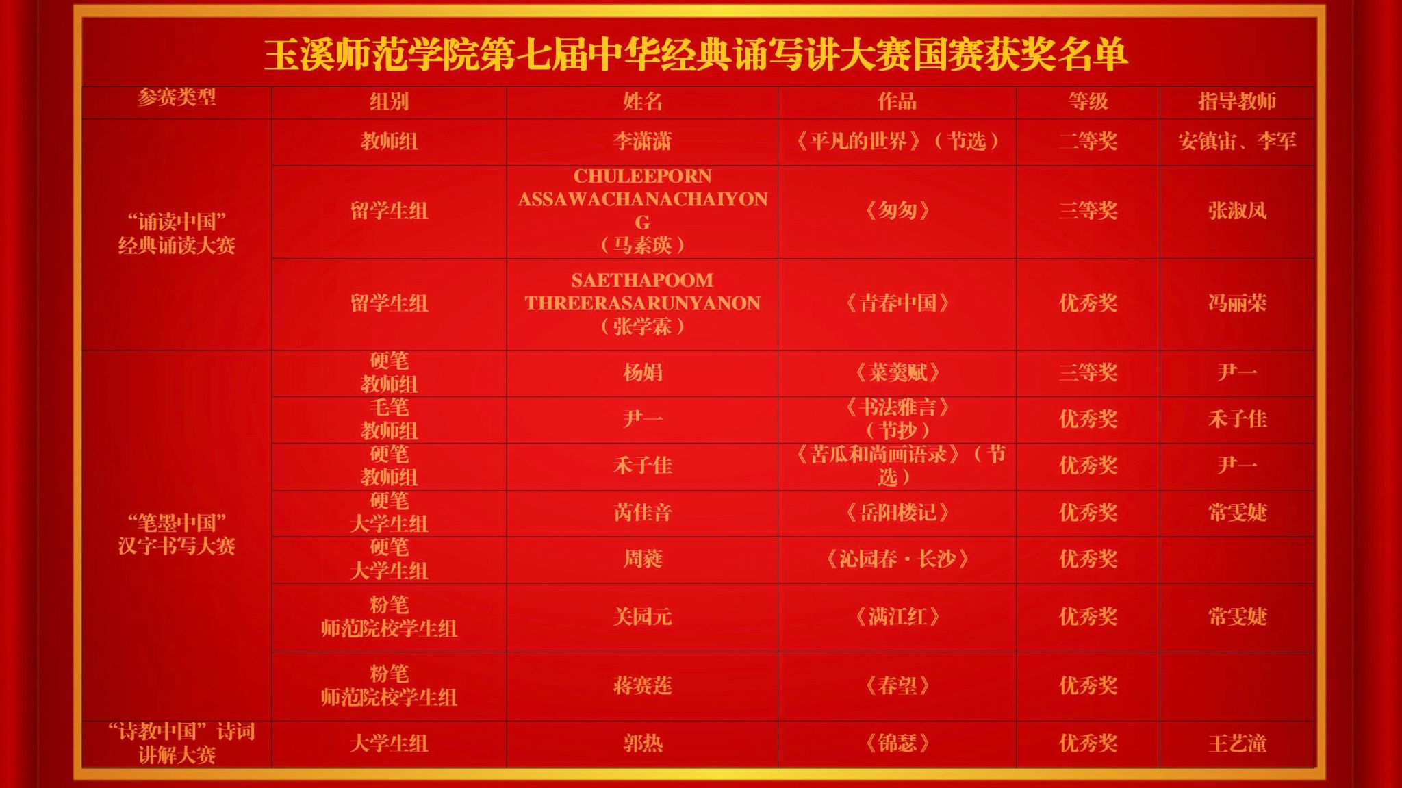 近日,第七届中华经典诵写讲大赛圆满完成各项评审并公布获奖结果。玉溪师范学院教师和中外学生在“诵读中国”“笔墨中国”“诗教中国”三大赛项中荣获全国二等奖等11个奖项。