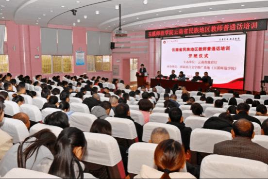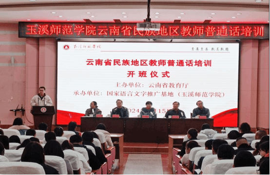 1月15日上午,云南省民族地区教师普通话培训开班仪式在玉溪师范学院顺利举行。云南省教育厅教材语管处二级调研员丁峰、玉溪师范学院副校长李明、玉溪市教体局语委办主任矣向阳,玉溪师范学院教务处处长、国家级语言文字推广基地副主任安镇宙,玉溪师范学院语委办主任、国家级语言文字推广基地副主任曹冰雪等出席开班仪式并致辞。